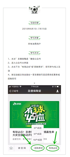 圣德保陶瓷在世界杯期間舉辦一系列線上活動:競猜有獎問答活動、組團購,享折上折活動,活動好玩、方便、優惠,驚喜不斷!所有人都能隨時隨地,不受地域、時間限制參與活動,贏取豐厚大獎,憑電子禮券均可在全國任一家圣德保陶瓷專賣店兌獎使用,體驗圣德保陶瓷的專業服務,享用圣德保陶瓷的優質產品,實現線上游戲,線下兌獎、享受服務的無縫對接。