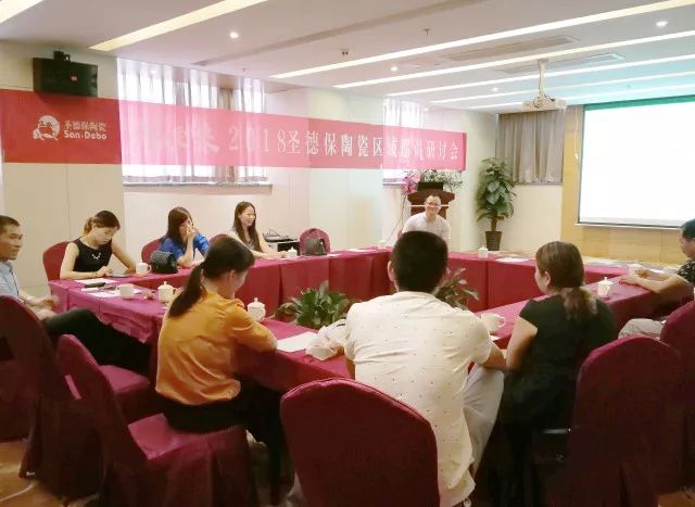 (宜春站,圣德保陶瓷銷售總經理嚴偉才在會上分析市場動態,講解品牌發展規劃)