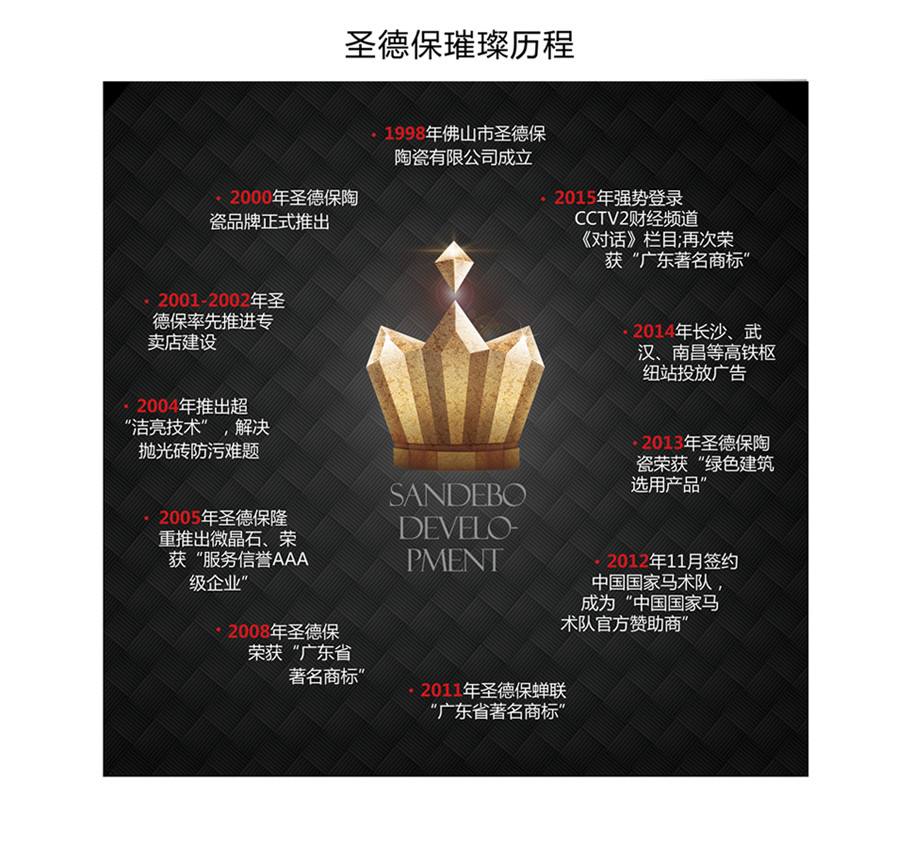 2012年圣德保品牌定位全新升級為“榮耀的傳承者”,2013年簽約國家馬術隊官方贊助商,發布《一起圣德保》MV,2014年全國高鐵樞紐站投放品牌廣告,2015年登陸央視財經頻道《對話》欄目,不斷拓寬圣德?!白鸪鐦s耀、積極進取、成功自信”品牌理念的傳播渠道。